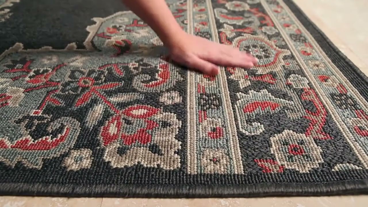 At just 0.16 inches thick, it lays flat and smooth on patios, decks, balconies, and covered porches, and it's soft enough to walk on barefoot. Customers rave about its rich, muted color palette — that vintage-black background reads more like a deep ashy charcoal in person, giving it an authentically aged feel. Easy to maintain with a quick vacuum or spot clean, and robot vacuum friendly too.