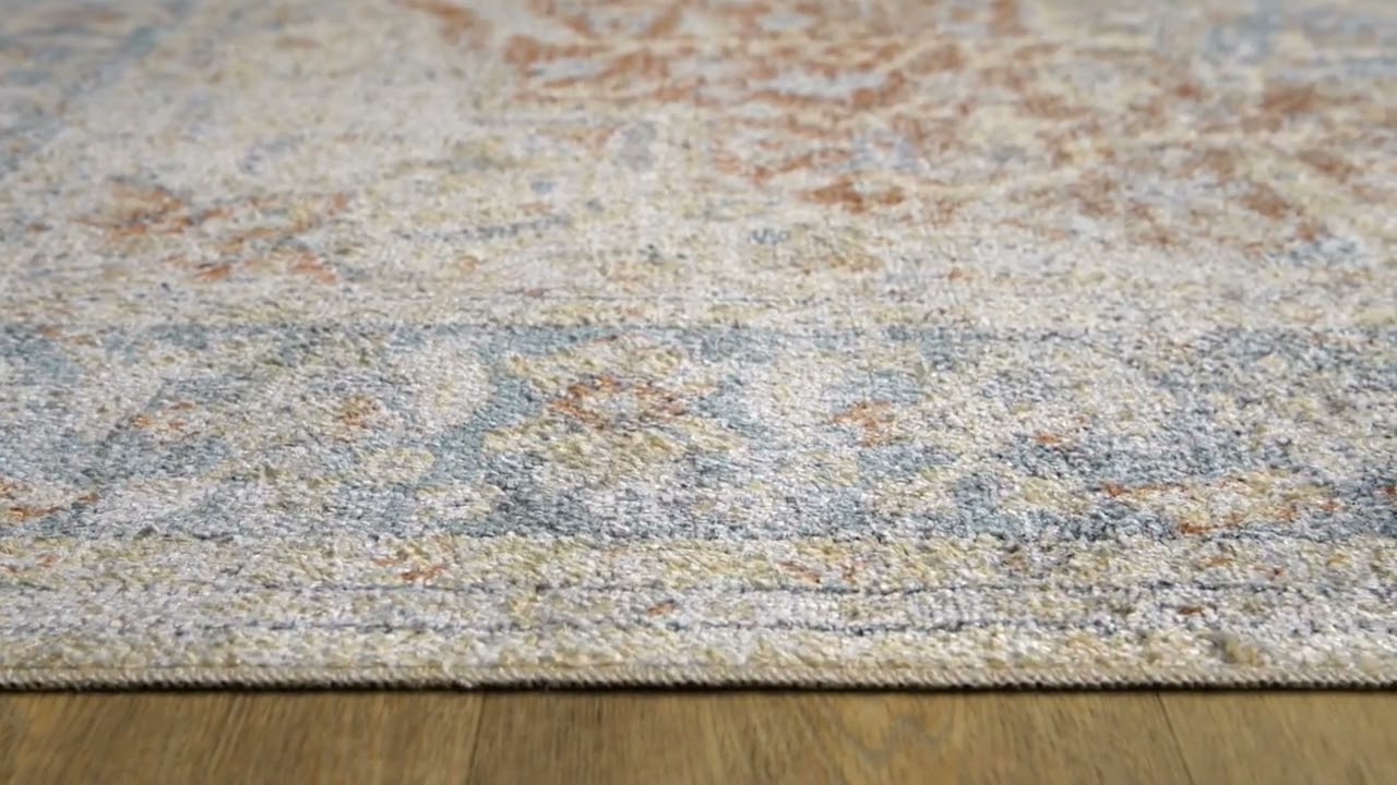 A fully washable Persian medallion rug in warm rust and blue — intricate traditional pattern, distressed vintage finish, and fringe detail with zero-stress cleanup.