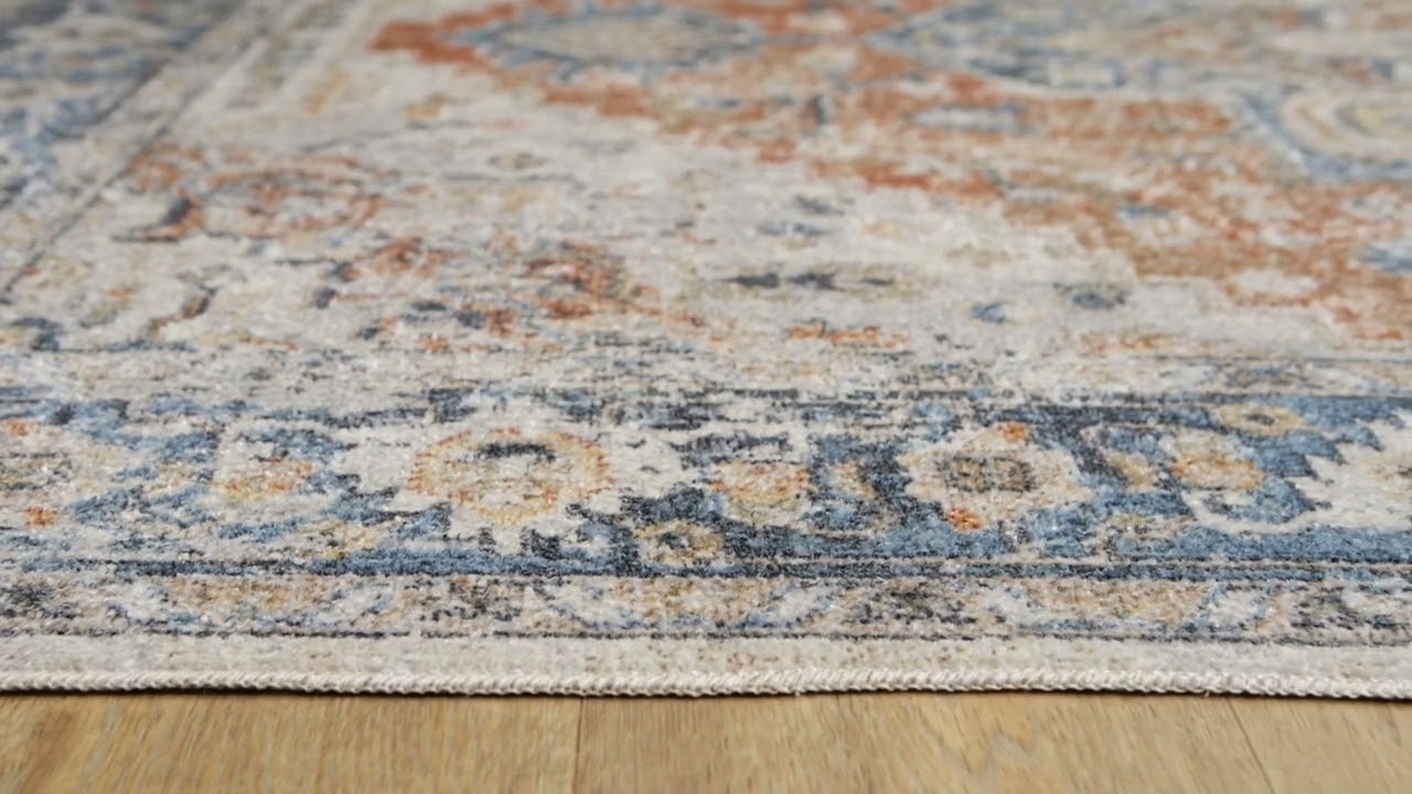 A rich rust medallion with dusty blue borders and a beautifully faded finish — this Persian-inspired Ezri rug is fully machine washable and built for real life.