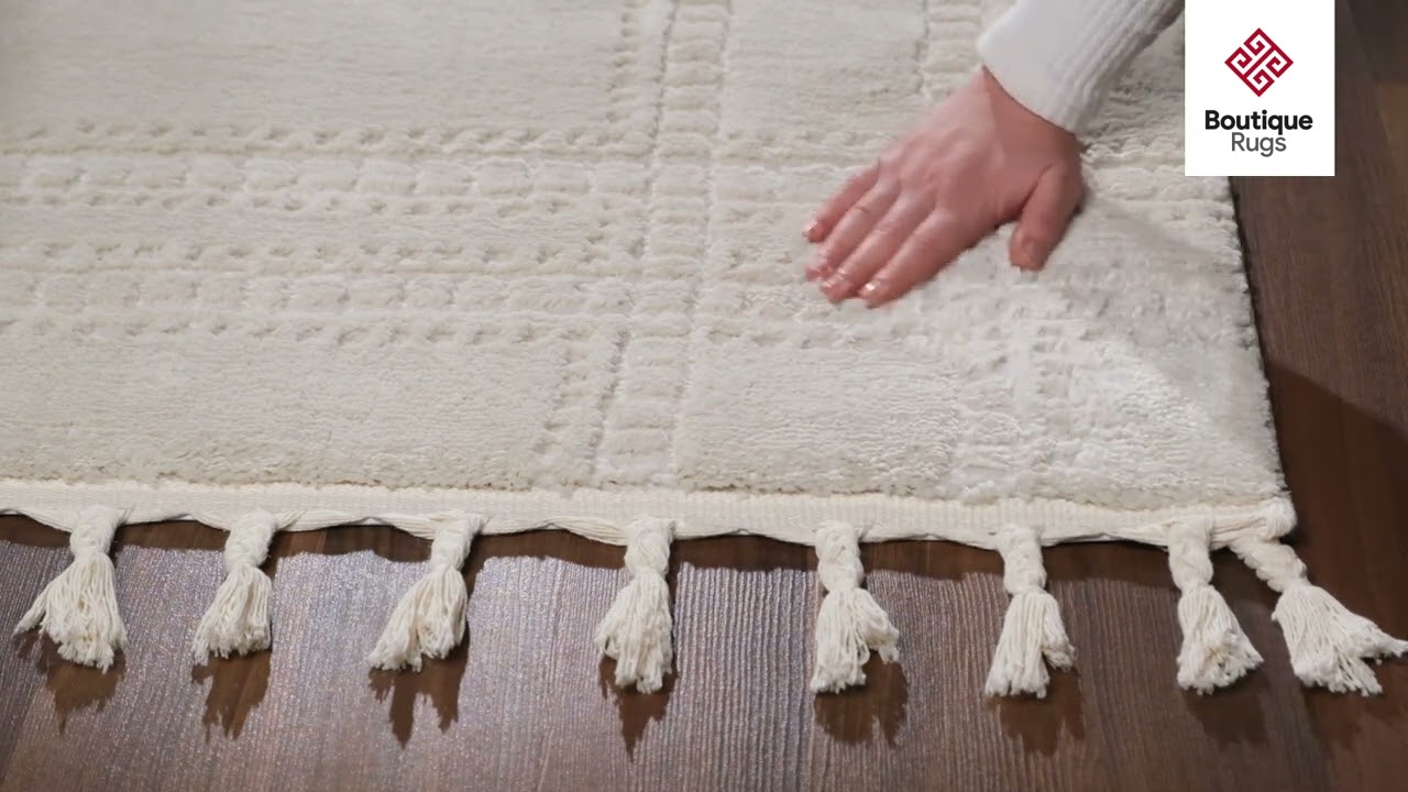 Soft, thick, and serenely neutral — the Ryuu's carved ivory border and white tassels bring effortless warmth to any room without competing with your décor.