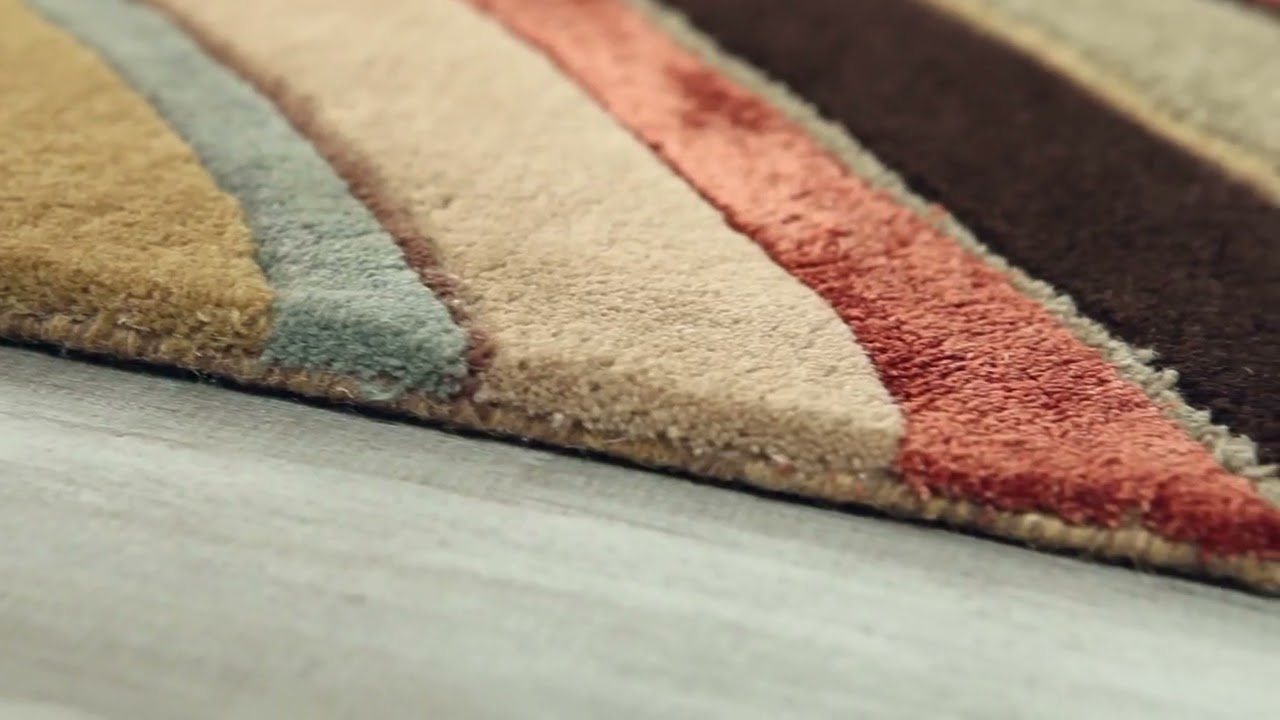 Sweeping wave-like stripes in rich earth tones — brown, black, slate, red, and gold — make the Seminole a bold, hand-tufted NZ wool rug that commands any room.