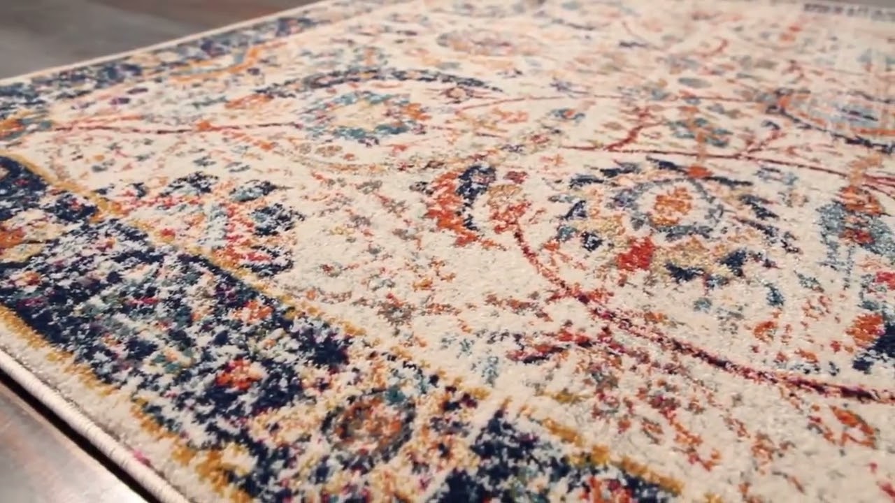 A vibrant Persian-inspired floral rug in cream, navy, and orange — intricate scrollwork and a distressed finish that adds instant character to any room.