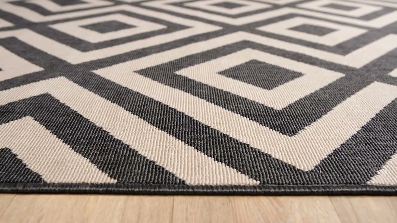 High-contrast black and cream diamond geometric pattern meets all-weather Olefin durability — the Spilsby is the patio rug that looks sharp and cleans up in minutes.