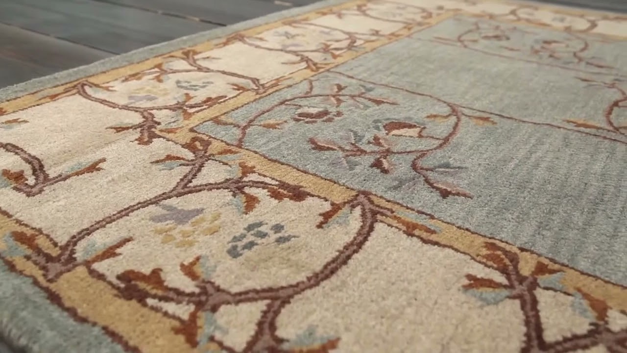 The Stringer Area Rug from the Caesar Collection brings timeless traditional style to any room with its soft sage green center field and intricate floral scrollwork. The field is framed by a wide cream and gold border filled with delicate vine and flower motifs, creating a layered, sophisticated look that feels both classic and fresh. Hand-tufted from 100% wool in India, this medium-pile rug offers genuine warmth underfoot and the kind of rich texture that only natural fiber can deliver.