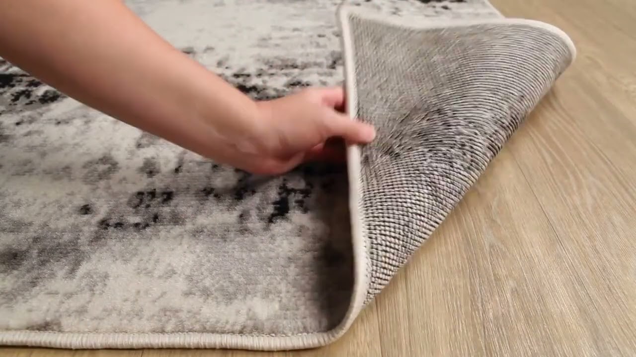 Soft gray and white abstract distressed design with a modern, faded-art feel — stain resistant polypropylene built for everyday living.
