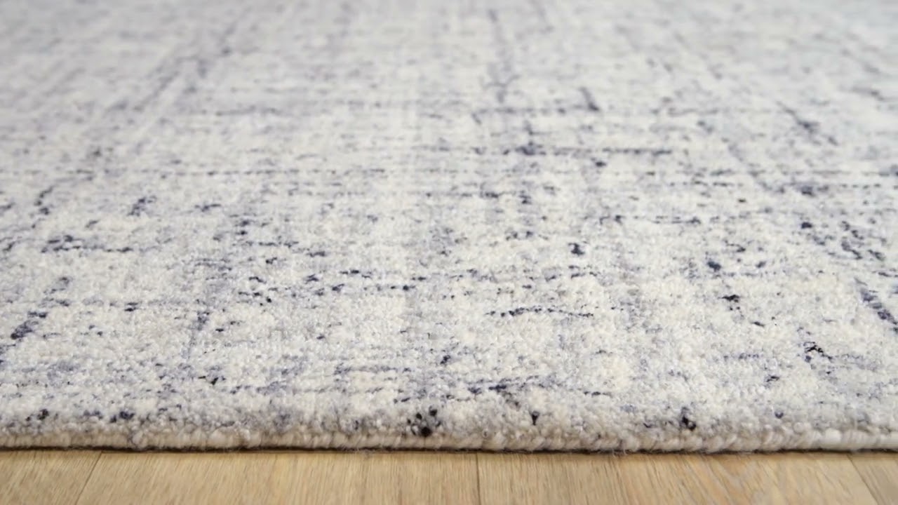 A hand-tufted 100% wool rug with a soft, heathered white-and-gray abstract surface — understated, textured, and built to last.