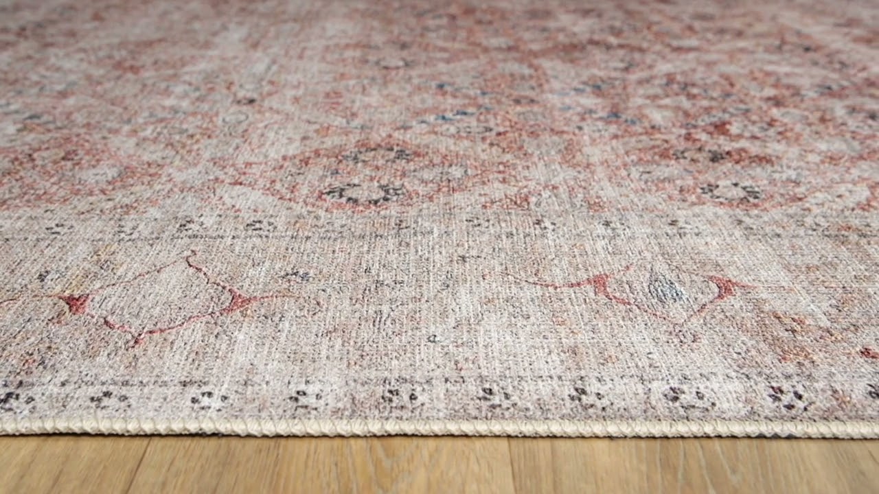 The Tapia Washable Area Rug brings the timeless beauty of a vintage Persian design into your home — without the worry. Its warm palette of rust, beige, and brown is layered with subtle hints of teal and blue, all woven together in an intricate distressed medallion pattern that looks like it's been treasured for generations. Machine woven from durable chenille-polyester, this rug sits ultra-flat at just 0.08 inches thick, making it ideal for high-traffic areas, under dining tables, or anywhere you need a stylish yet practical floor covering.