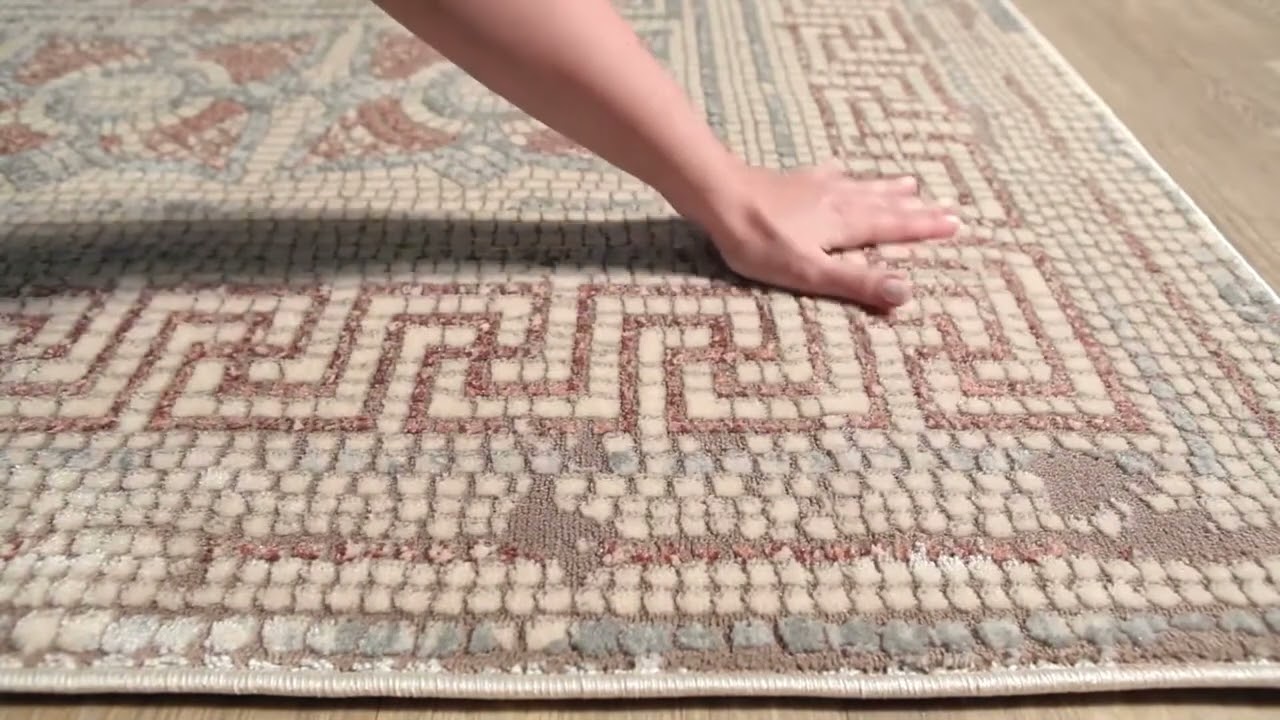Soft blush and cream tones with a stunning Greek key border and mosaic center — the Terlingua is a nursery and bedroom favorite that looks far more expensive than it is.