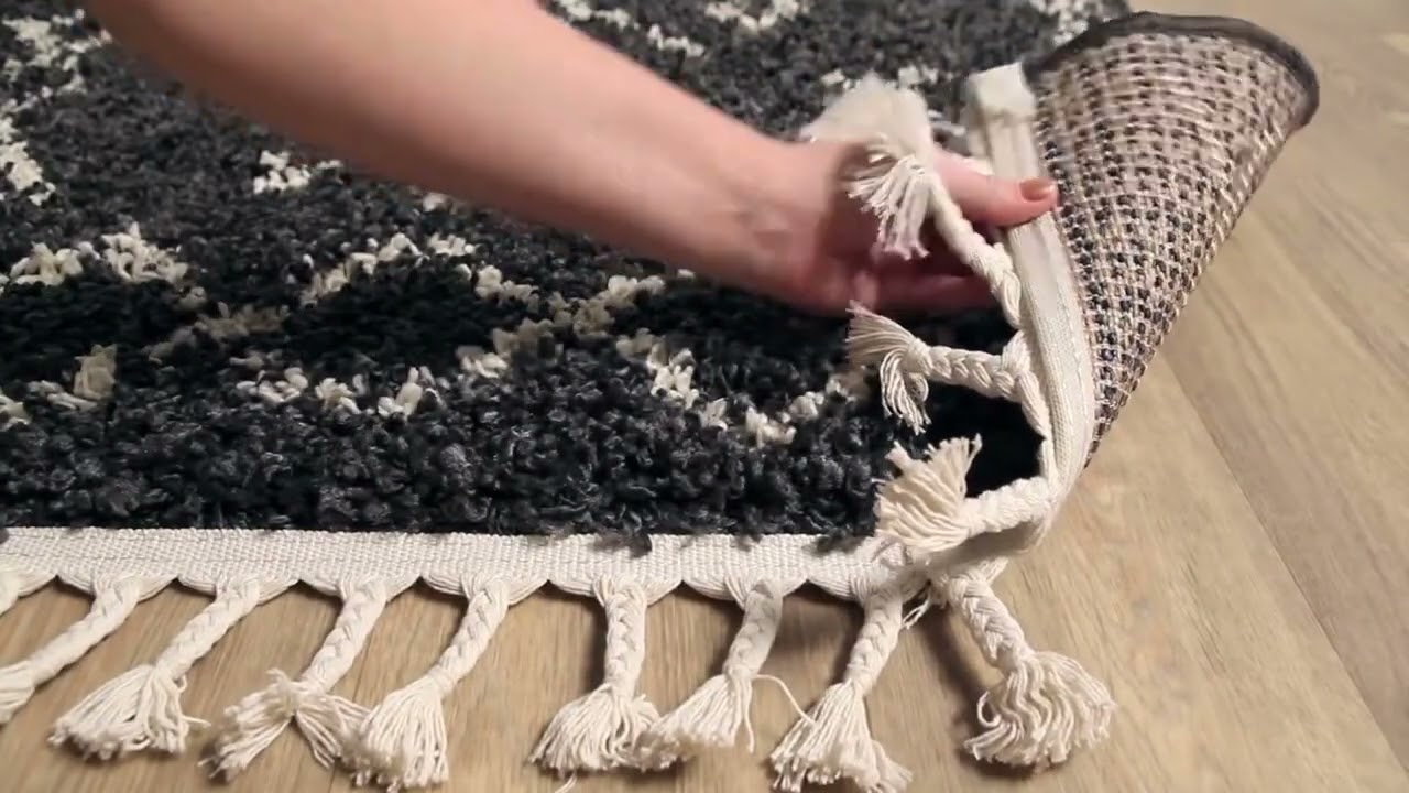 A plush black Moroccan Berber shag with bold white geometric diamonds and boho tassel fringe — soft, stain-resistant, and seriously stylish.