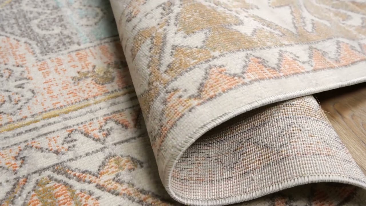 warm paletteA warm cream base sets the stage for a vibrant mix of burnt orange, mustard gold, soft teal, and charcoal gray — the colors concentrate in the central medallion and border details, giving the rug a jewel-toned focal point against a neutral field.
