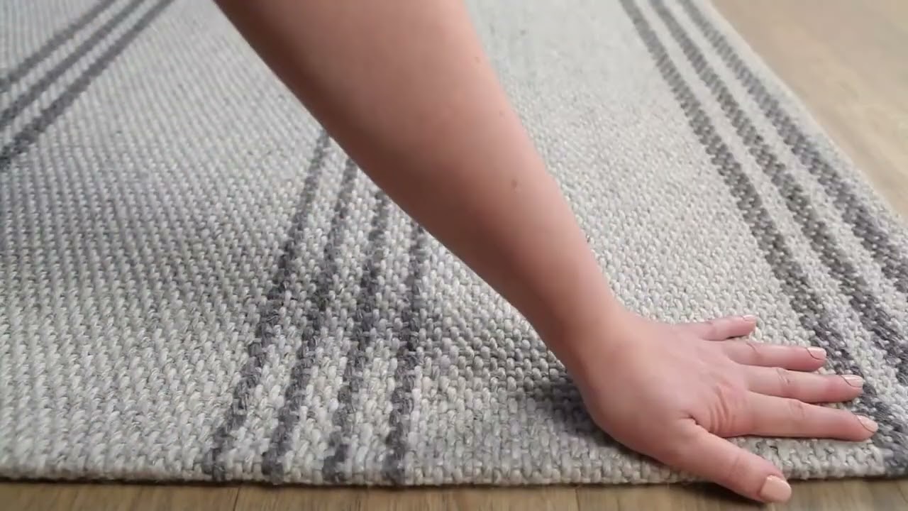 Classic vertical stripes in soft white and gray, hand-woven from wool and viscose — a timeless flatweave that fits effortlessly into farmhouse, coastal, or minimalist spaces.