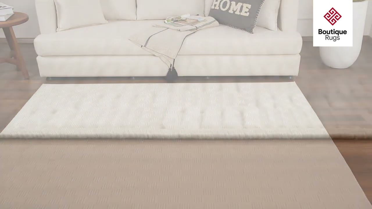 A soft bone-beige rug with a subtle 3D checkered pattern — fully machine washable, made from recycled polyester, and endlessly versatile in any modern space.