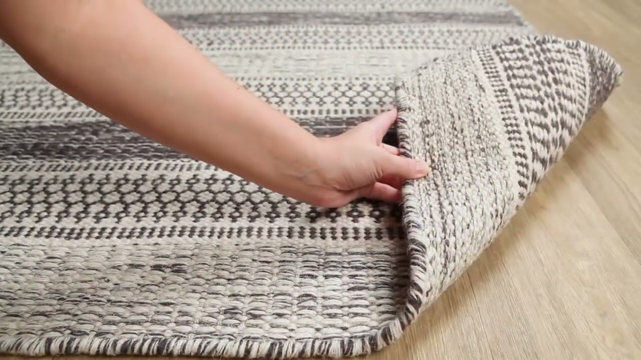 Hand-woven in 100% wool, the Vernonia brings a relaxed boho-tribal stripe pattern in soft gray and cream — a durable, no-pile flatweave that works in any high-traffic room.