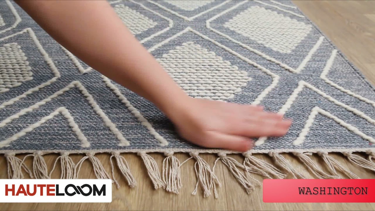 A hand-loomed cotton and wool flatweave with a soft denim blue trellis on cream — clean, coastal, and effortlessly versatile with fringe detail.