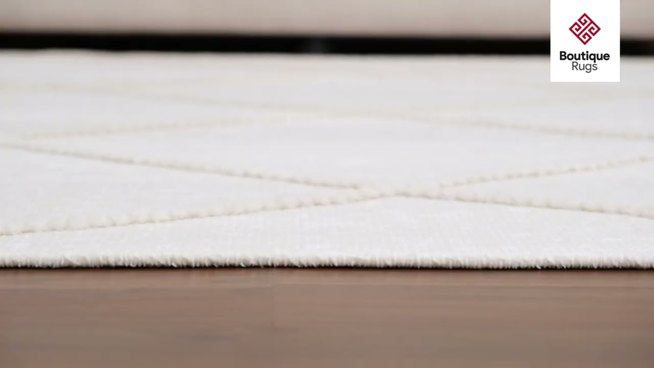 A soft off-white diamond trellis rug with beautiful high-low texture — and it's fully machine washable. Clean lines, neutral palette, real-life durability.