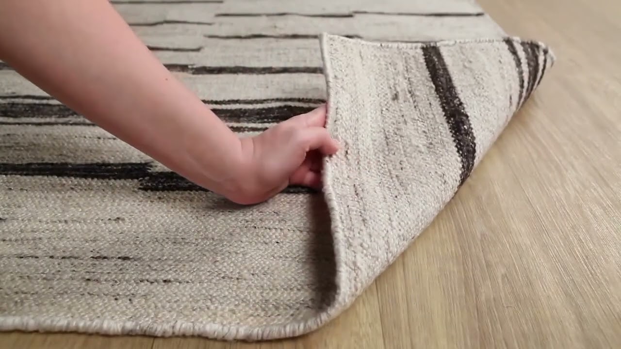 Bold broken stripes in black and cream, hand woven from wool and viscose — a modern flatweave that makes a quiet statement in any room.