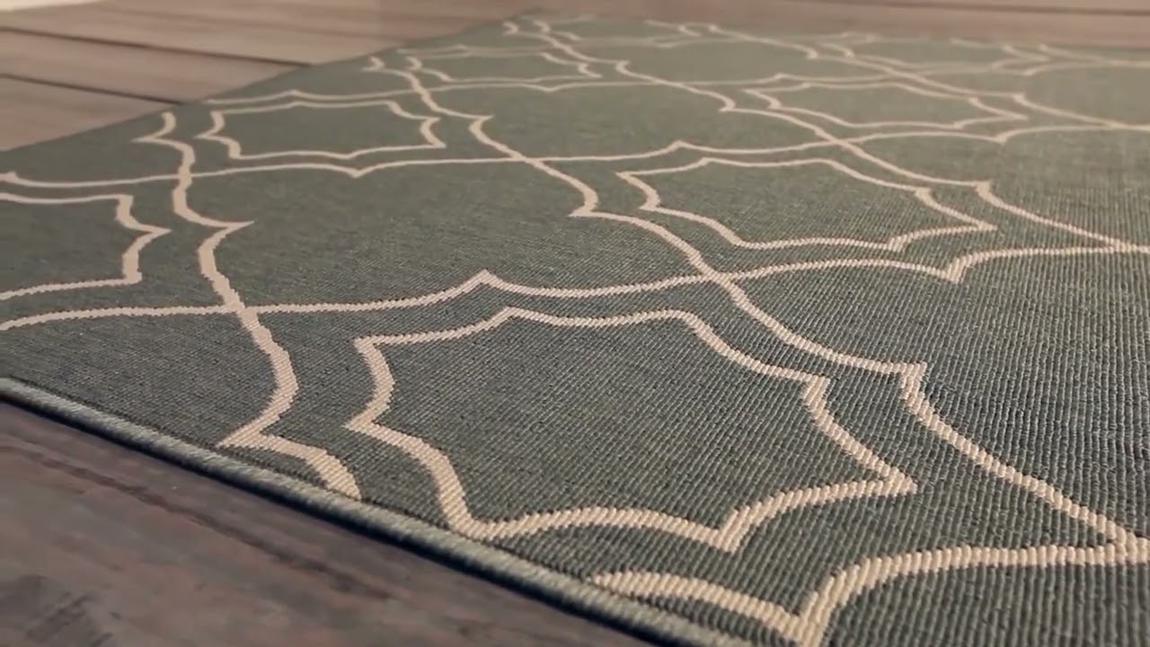 A soft sage green Moroccan trellis pattern that works indoors and out — hose-clean Olefin construction means style without the stress.