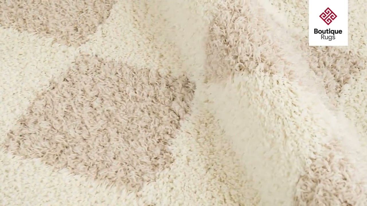 The Zahur area rug brings a fresh, modern twist to the classic diamond pattern with its plush, high-pile shag construction. Rendered in a soft two-tone palette of warm cream and sandy beige, the oversized diamond checkered design creates a subtle yet striking visual rhythm that works beautifully in living rooms, bedrooms, and cozy reading nooks. At nearly 2 inches of pile height, this rug is genuinely thick and fluffy underfoot — the kind you actually want to sink your toes into.