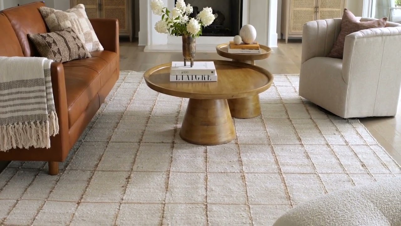 A handwoven natural jute rug with a soft cream and sandy tan irregular grid — understated farmhouse texture that layers beautifully in any neutral space.